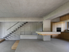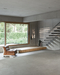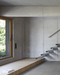 Some of the furnishings were integrated directly into the building structure, such as the kitchen worktop, which was cast in concrete onto a central pillar, making the construction itself part of the furniture. Built-in elements made of oak and raw oiled steel—like the kitchen, steps, railings, and fireplace—were custom-designed to suit the house.