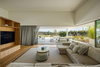 The neutral color palette and the natural textures contribute to a serene and sophisticated atmosphere, while architectural elements, such as the glass patio and different ceiling heights, add a visual interest and functionality.