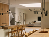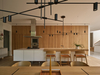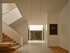 The project features many exterior and interior designs and architectural details. Particularly, the U-shaped staircase is designed to express and celebrate the 10° angle rotation, by centering the two staircase flights to different rectangular volumes. The trapezoidal skylight is placed at the top of the staircase shaft, bringing natural light all the way down to the basement through the central void. On the ground floor, the third step of the staircase transforms into a built-in bench, curved along the staircase wall, which acts as a waiting room between the main entry and the home office. On the outside, all the windows on the two rectangular volumes are recessed over 2’ and the main entry over 6’. By grouping multiple windows into four massive, recessed openings, scaled to the buildings rather than a human body, the sun casts large, sharp, and uninterrupted light and shadow on the building surfaces, engaging in an intimate conversation with the building. The house exudes a sublime presence, resisting a typical image of a house as represented in the area yet surrendering to the natural environment.