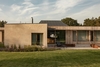 The material finishes of the facades correspond to different levels of intimacy around the site. The outward-facing walls are finished in textured plaster and are punctuated sparingly by windows. In contrast, the walls facing the garden and shielded terraces are clad in vertical narrow larch panels.
