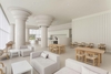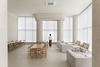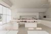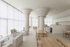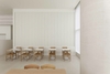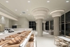 The columns and ceiling feature recurring circular details, adding both grandeur and softness to the space. Light enhances the dimensionality of these structures, giving them a rhythmic and dynamic presence that adds visual interest and vibrancy. Meanwhile, the overall color palette remains cohesive in a single tone, fostering a gentle and calming mood that encourages visitors to fully relax.