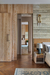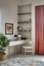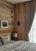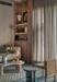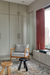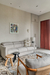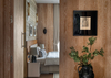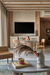 The material palette establishes a refined, monochromatic foundation, blending grey flooring tiles, taupe stucco walls, and beige veneer to create a cohesive visual harmony. In the master suite, warm wooden flooring pairs with accents of travertine marble and fluted panelling, enhancing the space’s understated opulence. The guest bedroom introduces a subtle variation through striped wallpaper, adding depth while maintaining the overarching tonal balance. Throughout the residence, carefully considered colour interventions enliven the earthy tones, while delicate brass detailing punctuates the design with quiet sophistication.