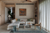 Conceived as an entertainment space, House IX accommodates a master suite and a guest bedroom, tailored to the clients’ vision of a tactile, grounded aesthetic distinct from their primary home. Kiran Gala & Associates’ signature approach is evident in the thoughtful juxtaposition of materials that evolve gracefully with time. The design transcends a purely rustic language by incorporating carefully curated artwork and accessories, enriched by striking blue and rust accents, infusing the interiors with a dynamic yet elegant character. Intricate ceiling details and a seamlessly integrated air conditioning system further enhance the refined sophistication of the space.