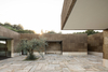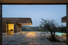 The pedestrian path to the house appears as a paved groove over the green surface of the land. A tectonic fault separates the volumes of the house dedicated to social spaces and private spaces, leading to the central courtyard. The house develops around the courtyard, embracing it. It creates an outdoor space for gathering, where horizontal overhangs frame the surrounding landscape.