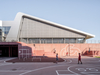 Project description provided by JAJA Architects - Assigned to transform a former loading area into a new plaza, our vision has been to create an urban space where sports and cultural life inside Gigantium – Aalborg’s biggest sports- and culture center – are carried further out to the outdoor space. Shades of red and white playful streaks lead people from the street into the square and give identity to the concrete elements.