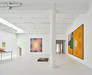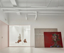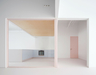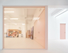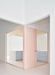 The more practical, intimate, or utilitarian areas—such as the kitchen, bathroom, and storage room—are seamlessly linked to the exhibition space by square glass partitions framed in pink, repeated throughout the layout. This unbroken visual connection keeps the artworks in constant view, while everyday scenes are framed as if they were additional photographs or paintings in the collection.