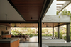 Toward the back, a patio anchors the social spaces. The kitchen and terrace open completely to the outside, and just a few steps down are enough for the terrace to feel more intimate without becoming isolated. Everything is enclosed by vegetation: a living barrier that replaces walls, allowing one to see without being seen.